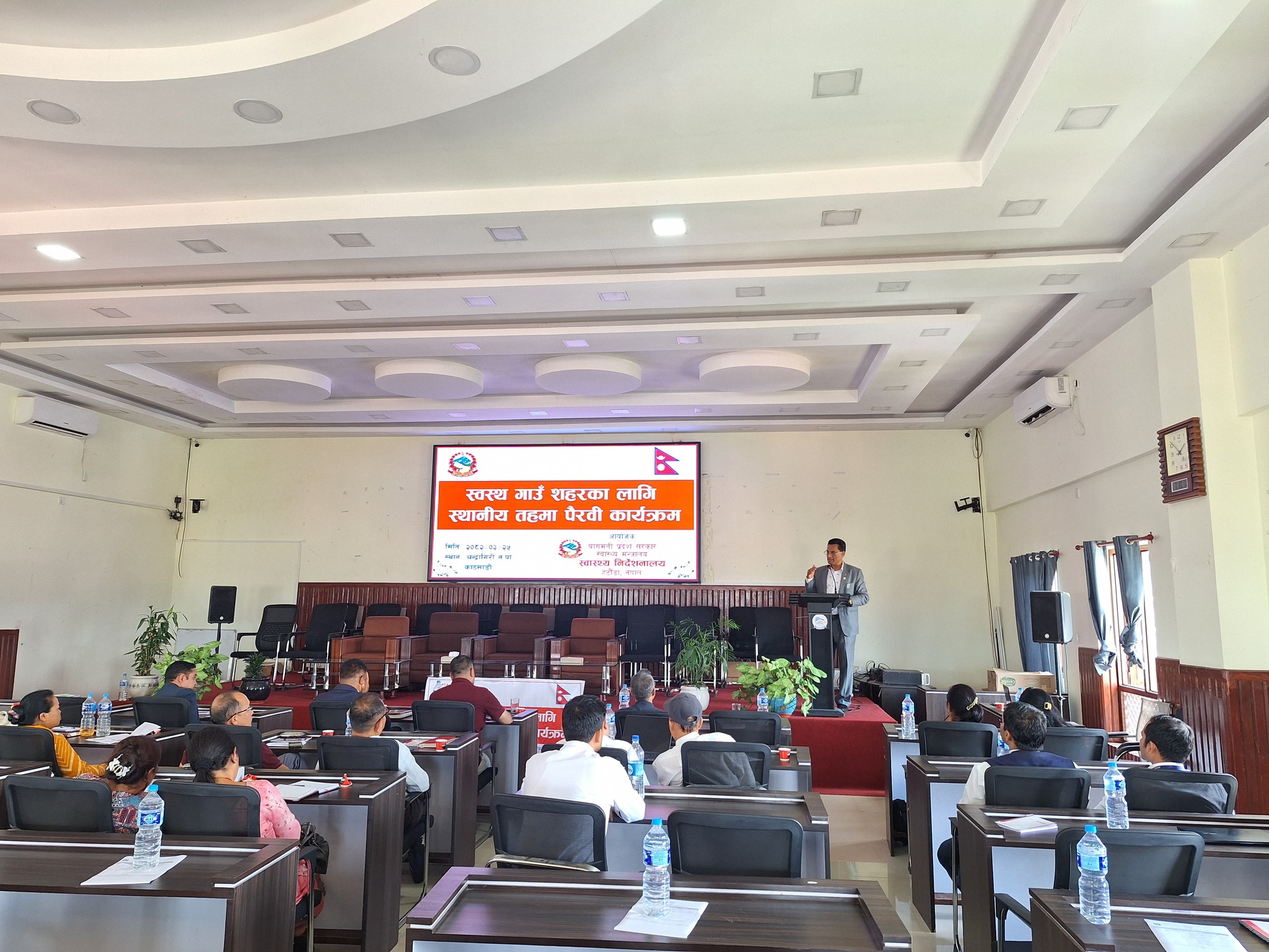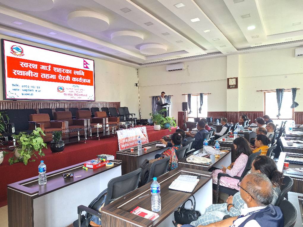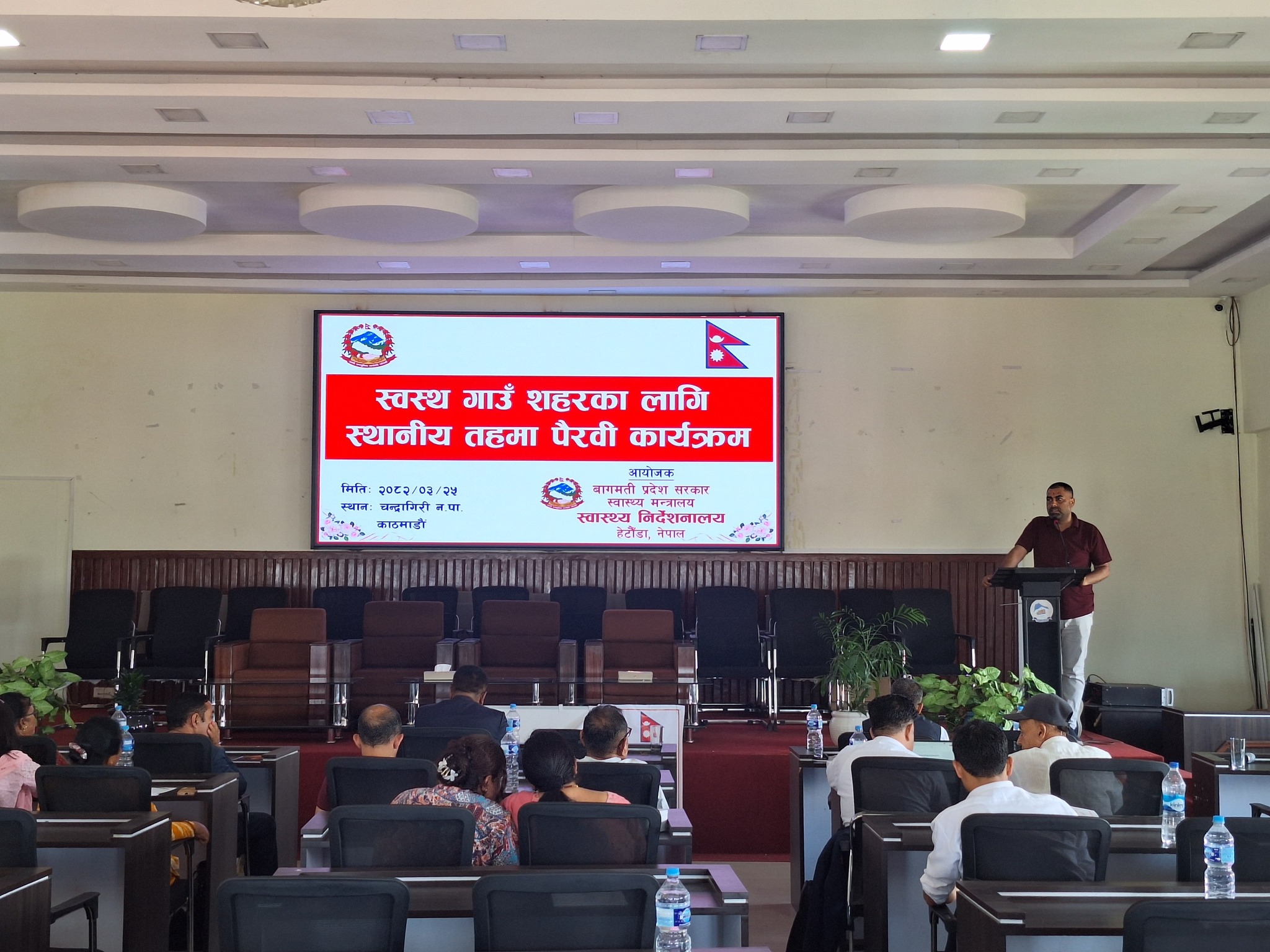 स्वास्थ्य निर्देशनालय बागमती प्रदेशद्वारा आयोजना गरिएको “स्वस्थ गाउँ शहरका लागी स्थानिय तहमा पैरवी कार्यक्रम" काठमाडौँ जिल्लाको चन्द्रागिरि नगरपालिकामा मिति २०८२/०३/२५ मा सम्पन्न भएको छ |