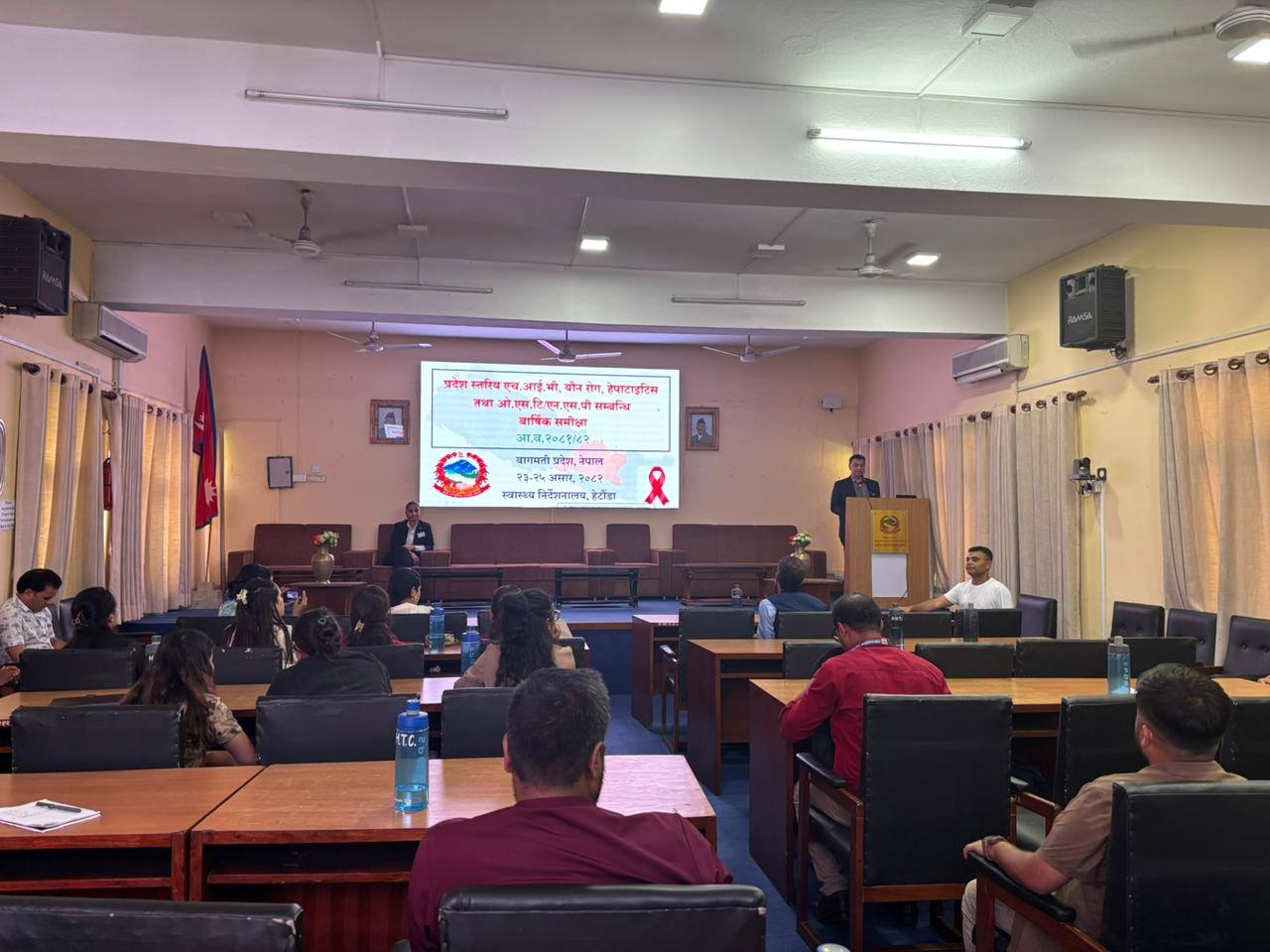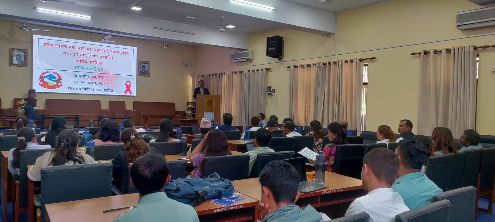 स्वास्थ्य निर्देशनालय बागमती प्रदेशद्वारा आयोजना गरिएको “प्रदेशस्तरीय एच.आई.भी, यौन रोग, हेपाटाइटिस तथा ओ.एस.टी/एन.एस.पी सम्बन्धी वार्षिक समीक्षा" काठमाडौँ जिल्लाको राष्ट्रिय स्वास्थ्य तालिम केन्द्रमा मिति २०८२/०३/२३ देखि २०८२/०३/२५ मा सम्पन्न भएको छ |